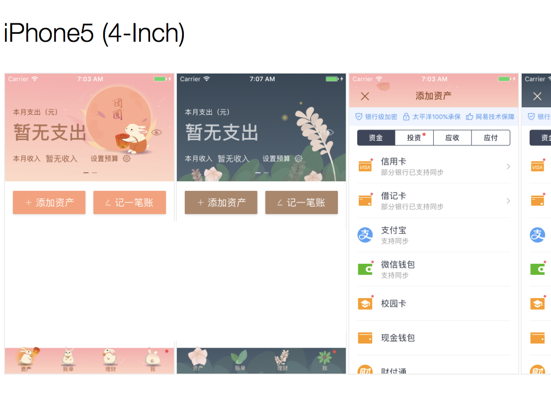 有钱的iOS2.7.5增加了主题功能,用户可以选择自己喜欢主题,主题数量大概有7种,在制作过程中,发现需要适配iPhone6、iPad、其他iPhone,3种不同的设备。所以我们需要对7 * 3 = 21种情况来检查皮肤是否显示正常(暂时不考虑多语言)。