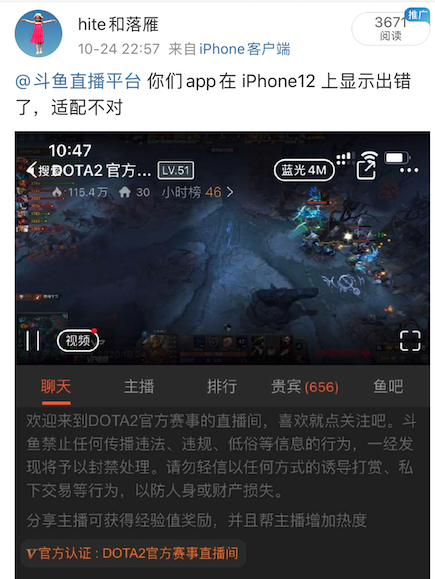 当我拿到蓝色 iPhone 12 的第一件事情就是看看各个 App 在适配方面有哪些异常表现,大概看了10 几个 App,除了 斗鱼,哔哩哔哩 外大部分适配都没有大问题。